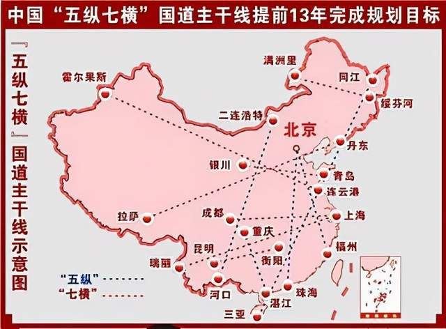 “五縱”指同江—三亞、北京—珠海、重慶—北海、北京—福州、二連浩特—河口。“七橫”指連云港—霍爾果斯、上?!啥?、上?!瘥?、衡陽(yáng)—昆明、青島—銀川、丹東—拉薩、綏芬河—滿洲里。